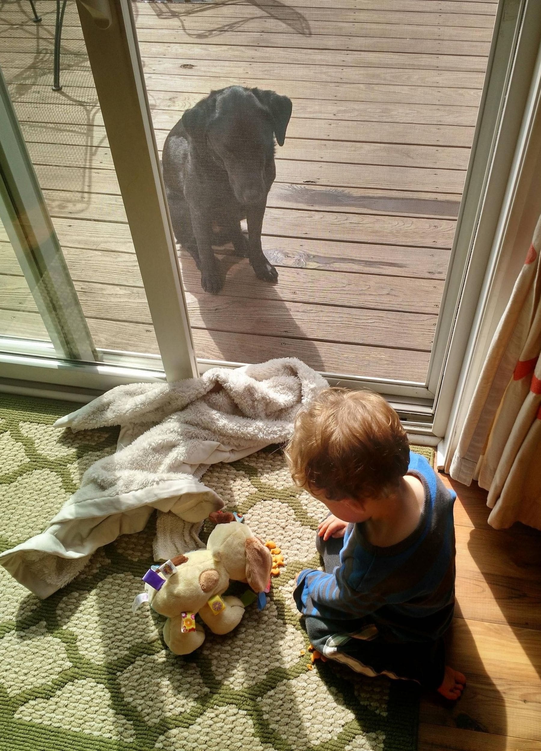 Alimenta su peluche, mientras que su verdadera mascota está en la parte de afuera de la casa