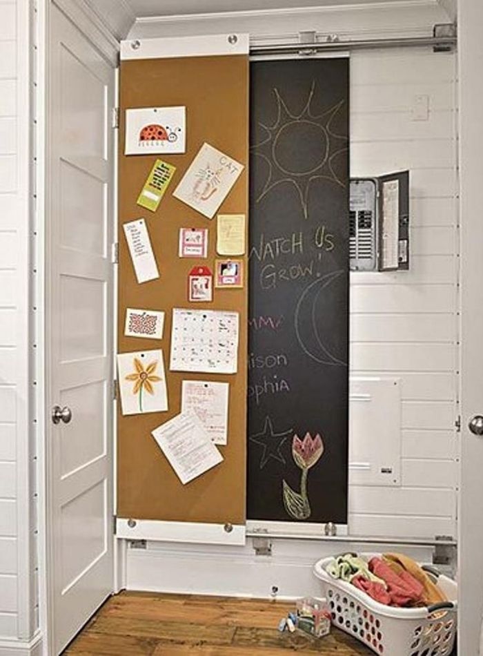 ¿Qué te parece instalar una pizarra deslizante donde está el cuadro de luces en tu casa? En el caso de que tengas hijos pequeños en casa, esta idea les gustará, ya que podrán anotar cosas en la pizarra.