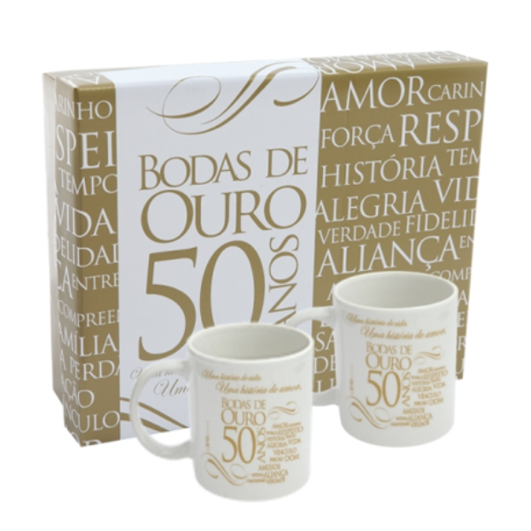 Solo porque son tazas no quiere decir que sean simples. Apuesta por un par de tazas hechas con material noble y con una impresión de igual buen gusto, haciendo referencia al aniversario de bodas. Puedes acompañarlas una caja tapizada y otros detalles que se refieren a la vida de la pareja.