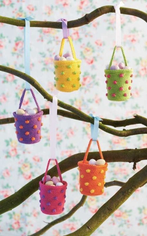 En Pascua, no pueden faltar canastas llenas de huevos con cacahuetes dulces. Como regalo, puedes hacer canastas de ganchillo que combinen aún más con toda la atmósfera familiar y artesanal de esa fecha.