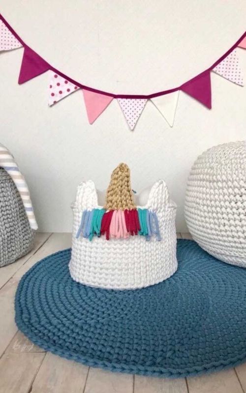 Esta también es una idea decorativa que se puede utilizar para guardar las mantas o los juguetes de los niños. Es una pieza útil y decorativa al mismo tiempo. Eso sí, ten cuidado a la hora de escoger los puntos y los colores.