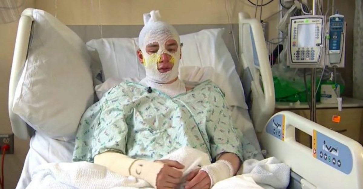 Afortunadamente, los niños y la hermana tuvieron quemaduras y excoriaciones leves, pero la condición de Derrick era realmente grave. Cuando se quitó la camisa para salvar a su sobrina, se quemó gravemente la espalda, los brazos y la cara.
