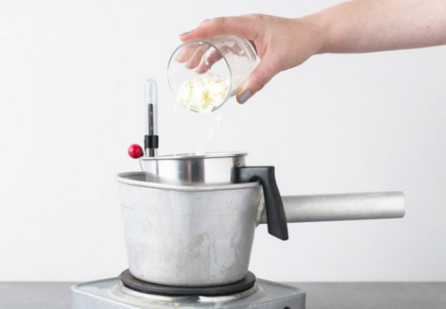 Para empezar este proceso, comienza colocando la cera en escamas en una de las cacerolas reservadas para este propósito únicamente.