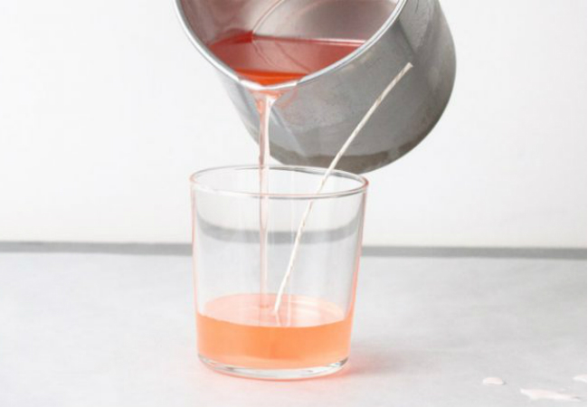 Con delicadeza, vierte la cera derretida en los frascos, teniendo cuidado de no desalinear la mecha. También ten cuidado para que este proceso no entre en el recipiente profundizado.