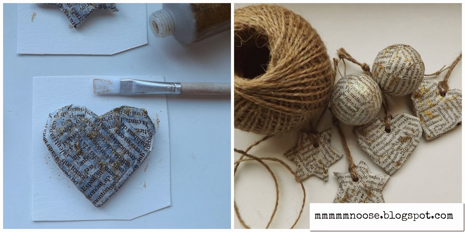 Una de las manualidades de navidad que dejará a todos con la boca abierta es la que se hace con papel de diario. Forra las bolas y corazones con periódicos viejos. Échales purpurina por encima y no te olvides de hacerles un agujerito para pasar la cuerda que te permitirá colgar los adornos del árbol.