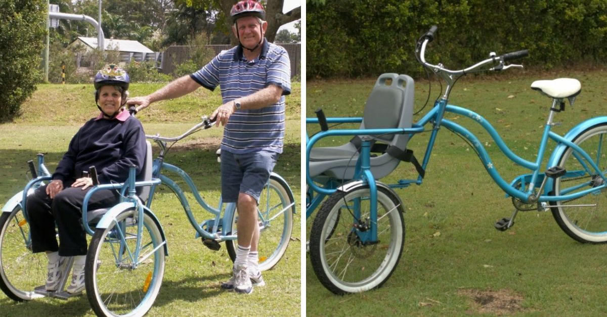 La idea funcionó. Bill pensó en todos los detalles para que su esposa se sintiera cómoda y segura durante todo el paseo. La bicicleta tiene un asiento para el conductor y una silla en la parte delantera para llevar a un acompañante, con cinturón de seguridad y reposapiés.