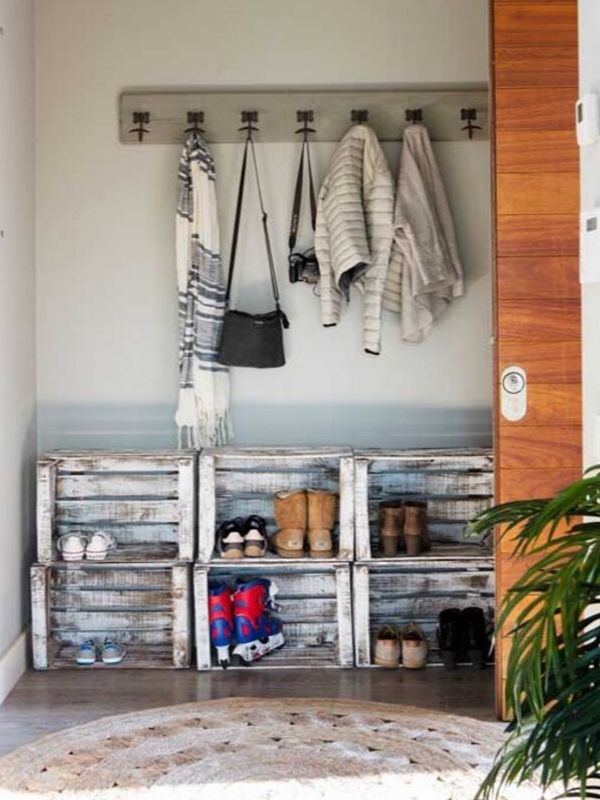Puedes comprar algunas cajas en la feria y aplicarles una pintura estilo pátina para darles un aspecto más desgastado, si ese es el estilo de tu decoración, luego ponlas en el vestíbulo para que sirvan como zapatero y banco al mismo tiempo.