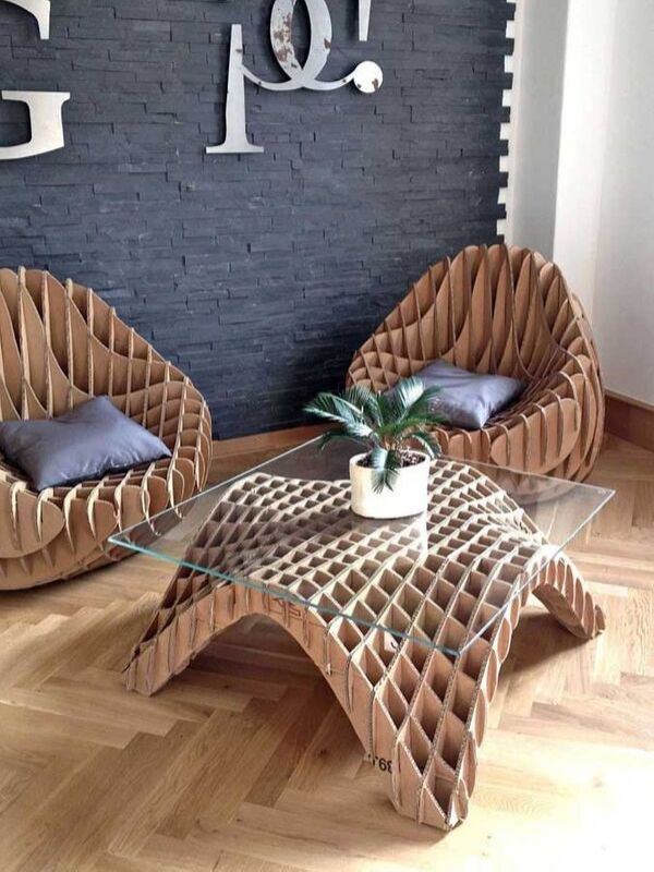 Con cartón también tienes una multitud de ideas para crear y hacer muebles reciclados. Mira lo moderno que es este juego de sillones con mesa de centro con un diseño exclusivo.