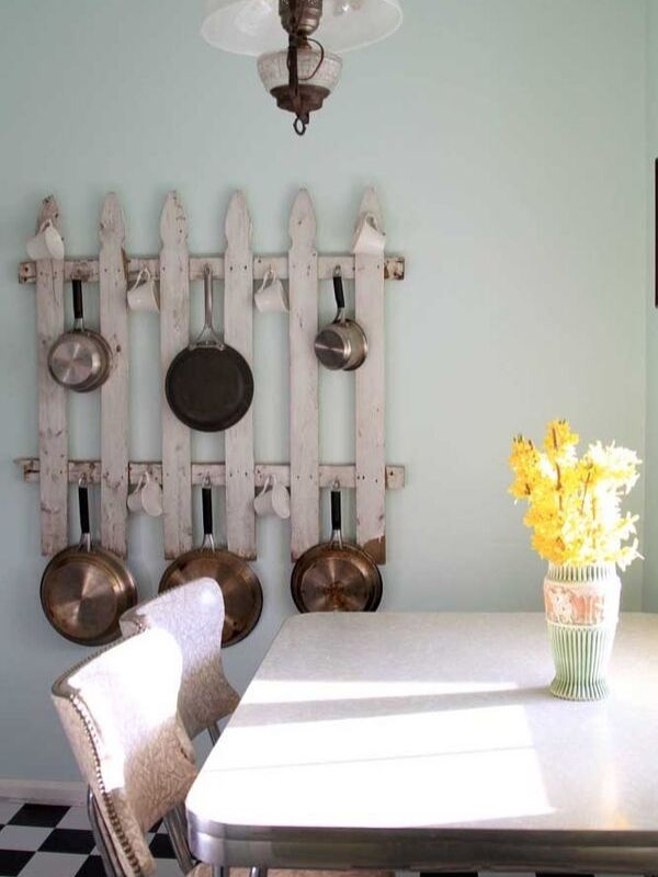 Cuando vayas a renovar la puerta de tu casa, no tires la vieja. Restáurala con un buen papel de lija y pintura nueva para que sirva como colgador de platos en tu cocina de estilo rústico.