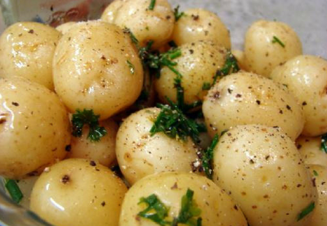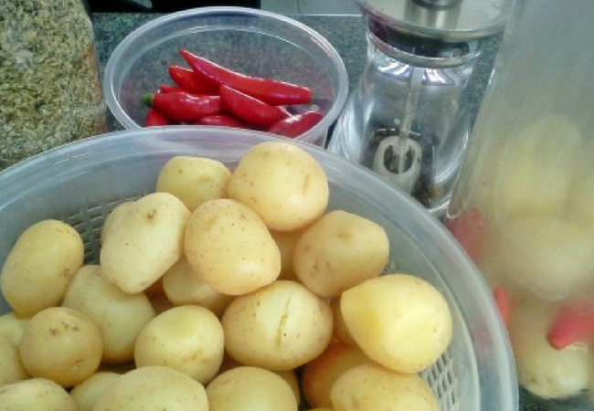 2. Lava bien las papas y clávales un palillo para hacerles agujeros. Cocínalas cubiertas con agua y caldo de pollo. Deja hasta que esté cocido, pero no demasiado blando para que queden enteras.