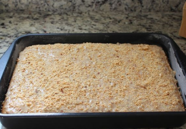 6. Haz la cobertura mezclando la leche con el azúcar en un tazón. Después, vierte sobre el pastel frío, espolvorea con maní y deja secar. Luego, estará listo para servir.