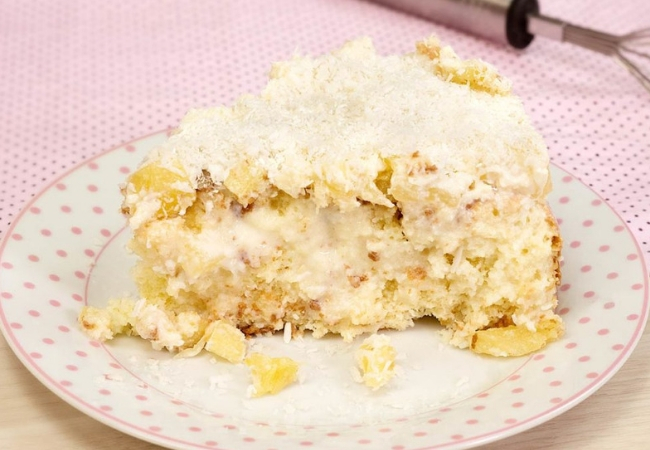 La piña, ya que tiene mucho jugo, dejará la torta tan húmeda como la versión con zumo de naranja. Para la masa, necesitarás huevos, leche, azúcar, trigo y levadura. Después, haz un almíbar con piña picada y azúcar y acaba con una crema blanca a base de leche, almidón, leche condensada, crema de leche, chocolate blanco y coco rallado.