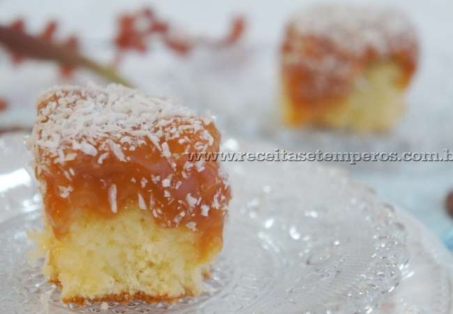 El sabor del zumo de naranja combina muy bien con el coco y queda muy bien en esta masa bien húmeda. La masa está hecha con trigo, azúcar, huevos, zumo de naranja y levadura. Para la cobertura, puedes optar entre un brigadeiro de coco o una opción con claras al punto de nieve, crema de leche, azúcar y coco rallado.