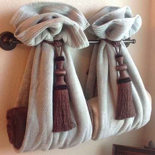 Para este consejo, ni siquiera necesitas una máquina de coser, solo una cuerda bonita como las que sostienen la cortina. Basta con colocar las toallas unidas al toallero en el baño y emplearlas para almacenar otras toallas o papel higiénico.