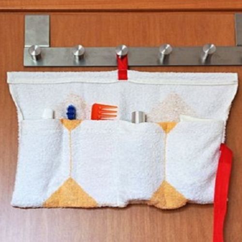 Para aquellos que no tienen mucho espacio dentro del baño, con armarios para almacenar objetos pequeños, el consejo es coser bolsillos en una toalla de baño o en la cara para servir como organizador. Incluso ayuda a mantener los cepillos secos.