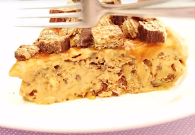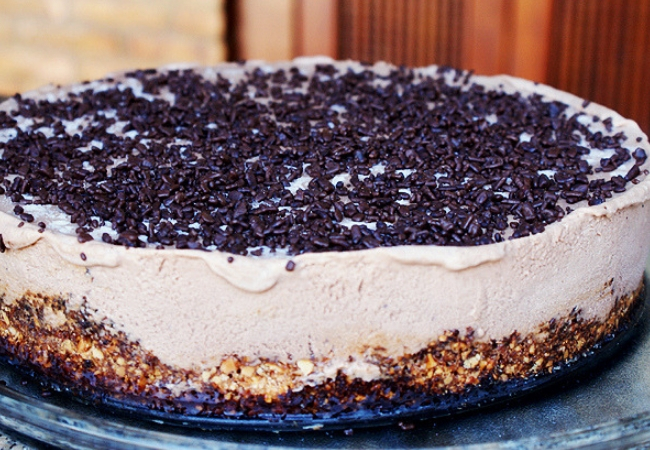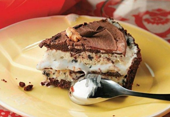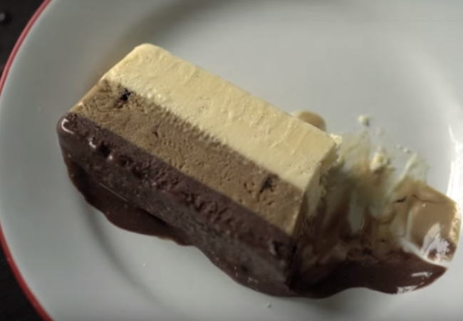 Esta es una versión un poco más incrementada. Primero haces una base crujiente, que lleva nueces molidas, mantequilla y azúcar morena. Para la crema de helado, que se coloca por encima, se usa leche, azúcar glas, yemas de huevo, claras de huevo, chocolate medio amargo y crema de leche fresca.