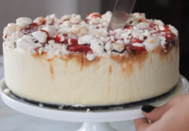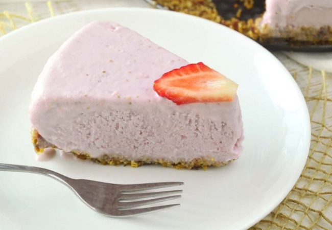 Para los veganos también hay una opción, que es bonita y deliciosa. La corteza base se hace con dátiles y semillas oleaginosas, puedes mezclar almendras, nueces y castañas. Por encima va una crema a base de frutillas, leche de coco, aceite de coco y azúcar cristal. Ni te imaginarías que con tan pocos ingredientes podrías tener como resultado una torta con este volumen.