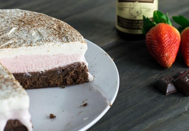 El helado napolitano combina los sabores de chocolate, fresa y vainilla o crema. Entonces, básicamente esta es la composición de la tarta, pero con todo hecho de manera artesanal. La capa base es un delicioso brownie. Después va un helado casero de fresa y, por encima, una crema de vainilla muy cremosa y ligera. ¡A disfrutarla!