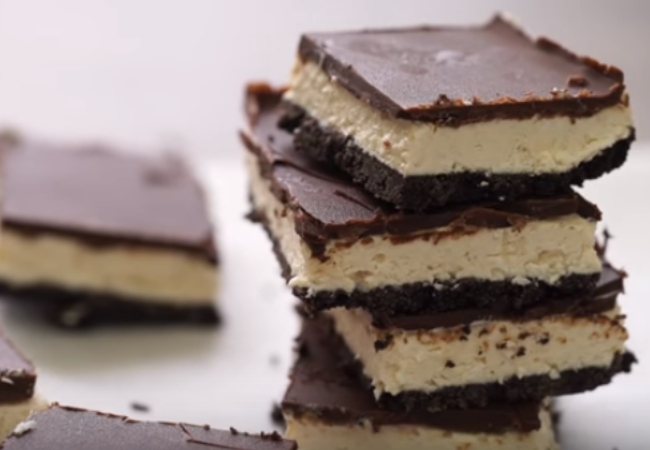 Otra tarta más que es muy bonita para servir en cuadraditos. Lleva tres capas, la primera es Oreo, muy delgada, después una crema de coco y, por encima, un almíbar de chocolate cremoso. Por último, solo tendrás que meterla en el congelador para que quede al punto.