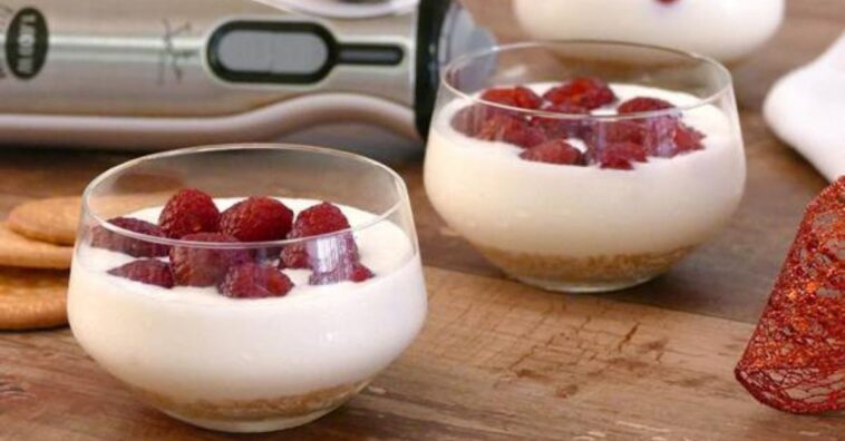 6. Para finalizar, sirve los vasitos de tarta de queso con frambuesa y disfruta de esta versión más cremosa del famoso cheesecake.