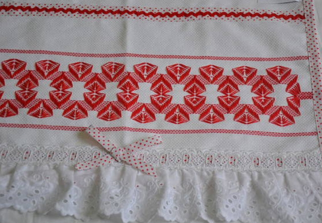 Usando la misma técnica que para hacer la cenefa en línea (o con hilo), puedes hacerlo con cintas de raso. La principal diferencia será que la tela de la cenefa necesitará espacios más grandes para que puedas pasar la cinta, ya que es más ancha. Asimismo, existen detalles de la técnica para pasar la cinta a través de la tela, con el fin de dar diferentes efectos, pero sigue siendo bastante simple.